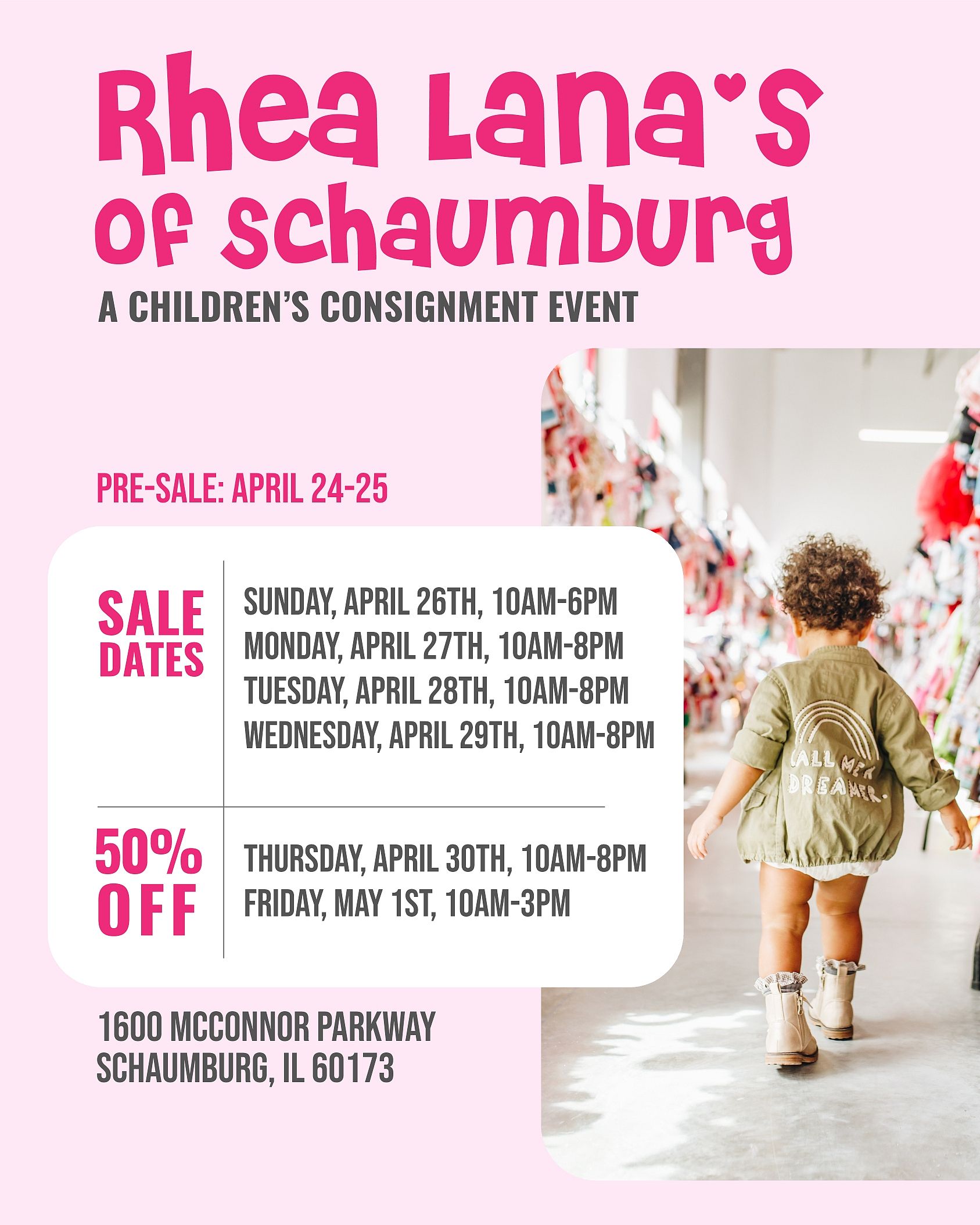 Rhea Lana's of Schaumburg is a children's consignment event happening April 26 โ May 1 at 1600 McConnor Parkway in Schaumburg.